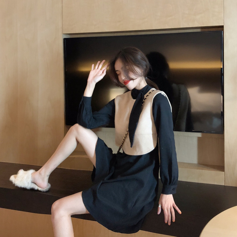 秋裝女2018新款套裝時尚呢子馬甲女+高腰中長款連衣裙網紅兩件套
