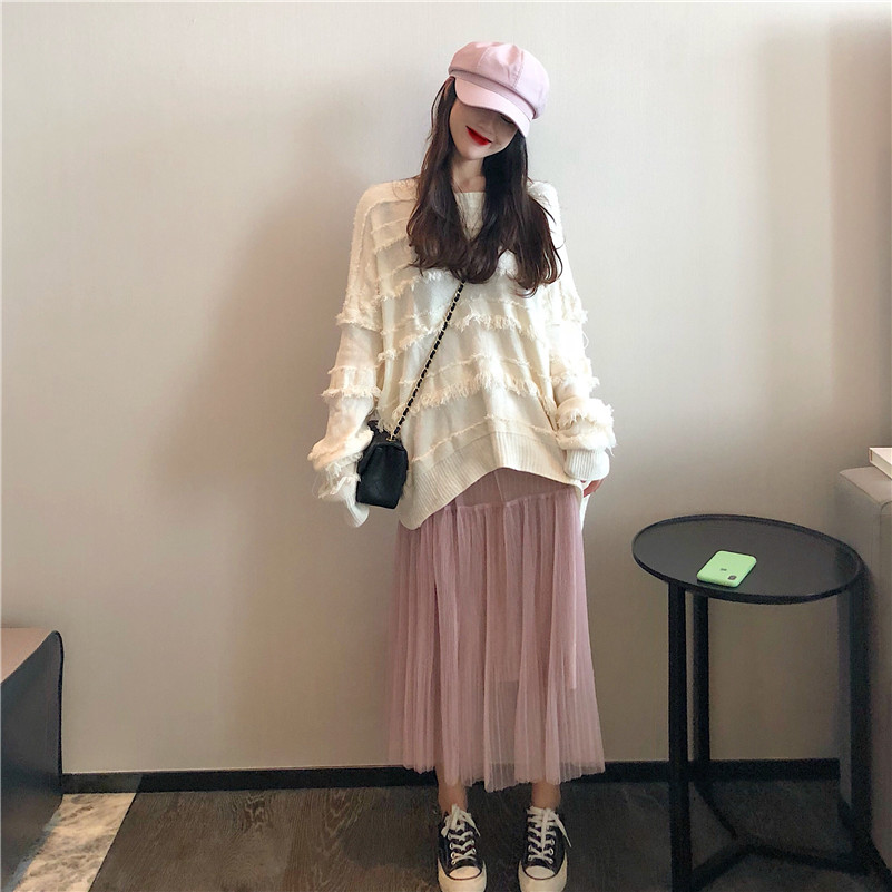 2018秋裝新款韓版長袖毛衣女裝氣質兩件套高腰甜美網紗裙時尚套裝