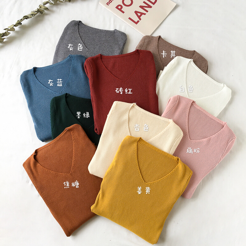 韓版氣質V領針織長袖修身緊身保暖打底衫上衣復古套頭顯瘦毛衣女