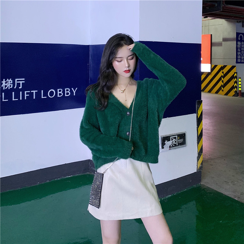 針織衫秋冬慵懶寬松短款毛衣女2018新款外套+高腰包臀皮裙半身裙