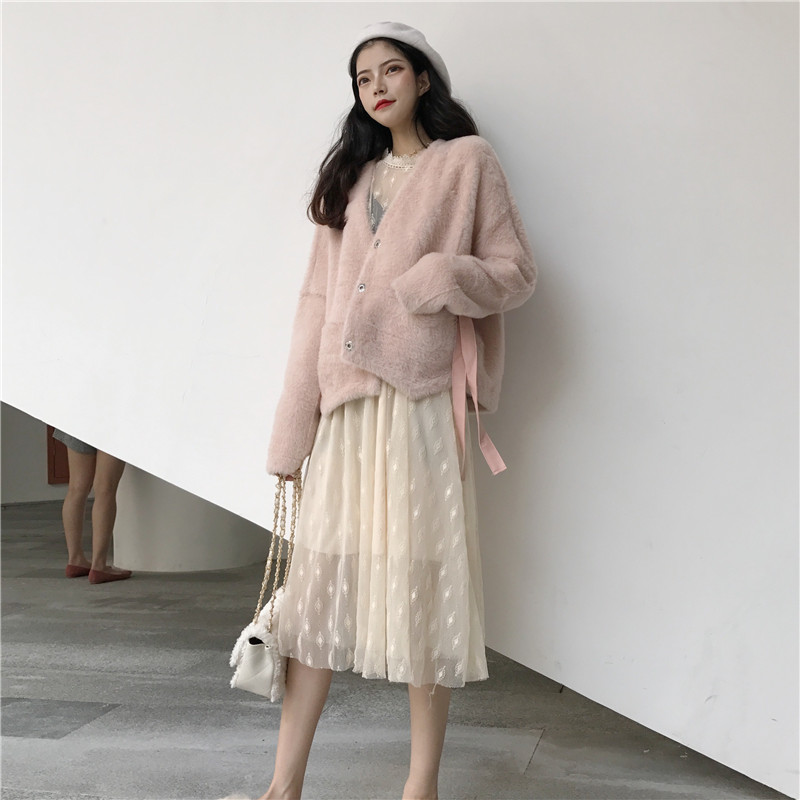 馬海毛網紅毛衣女2018新款針織開衫外套冷淡風針織吊帶連衣裙套裝
