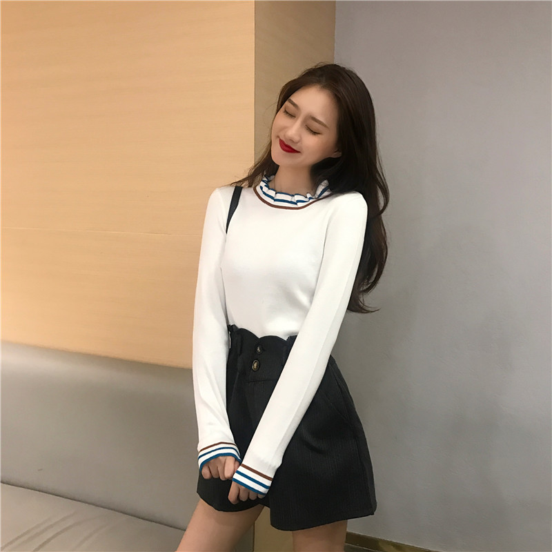 韓國復古風毛衣女秋冬2018新款修身顯瘦百搭木耳邊針織打底衫上衣