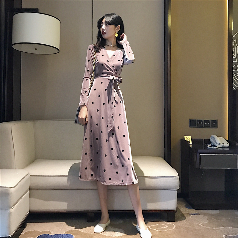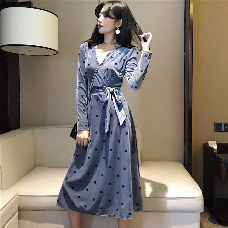 晚晚風新款韓版秋季時尚氣質百搭絲絨波點連衣裙綁帶收腰打底裙女
