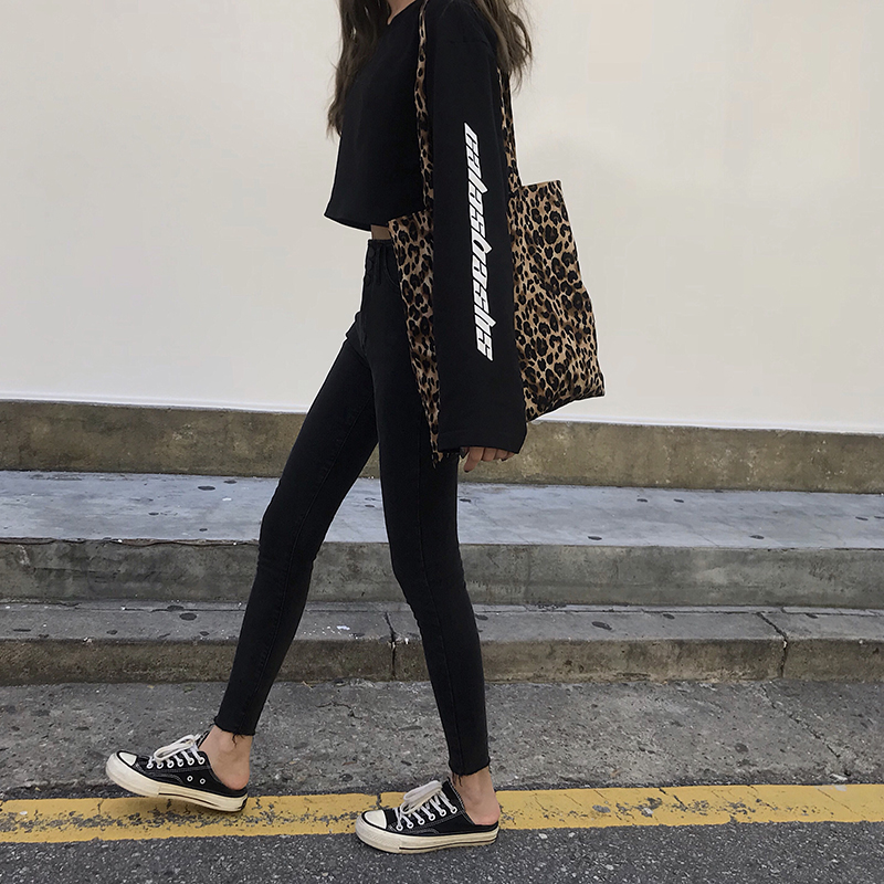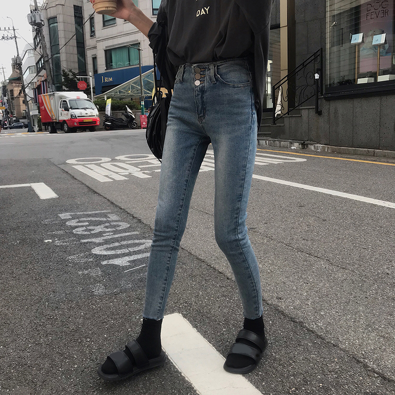 / 褲子2018秋裝新款韓版小清新水洗單排扣高腰毛邊九分牛仔鉛筆褲女