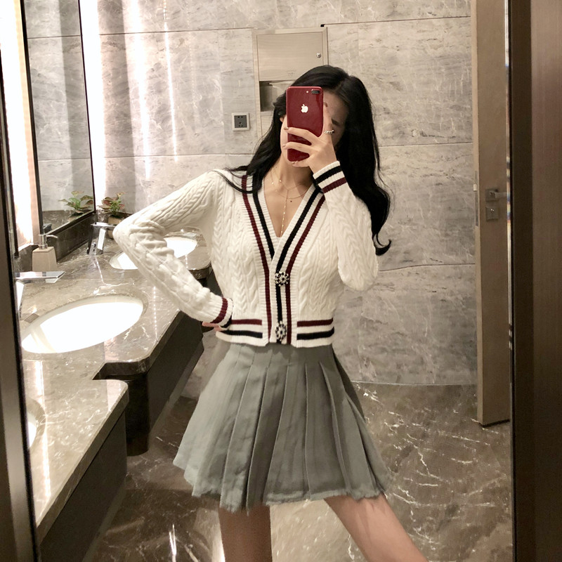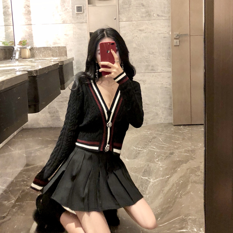 / 新款chic時尚套裝秋冬學院風減齡少女修身針織開衫短裙百搭兩件套