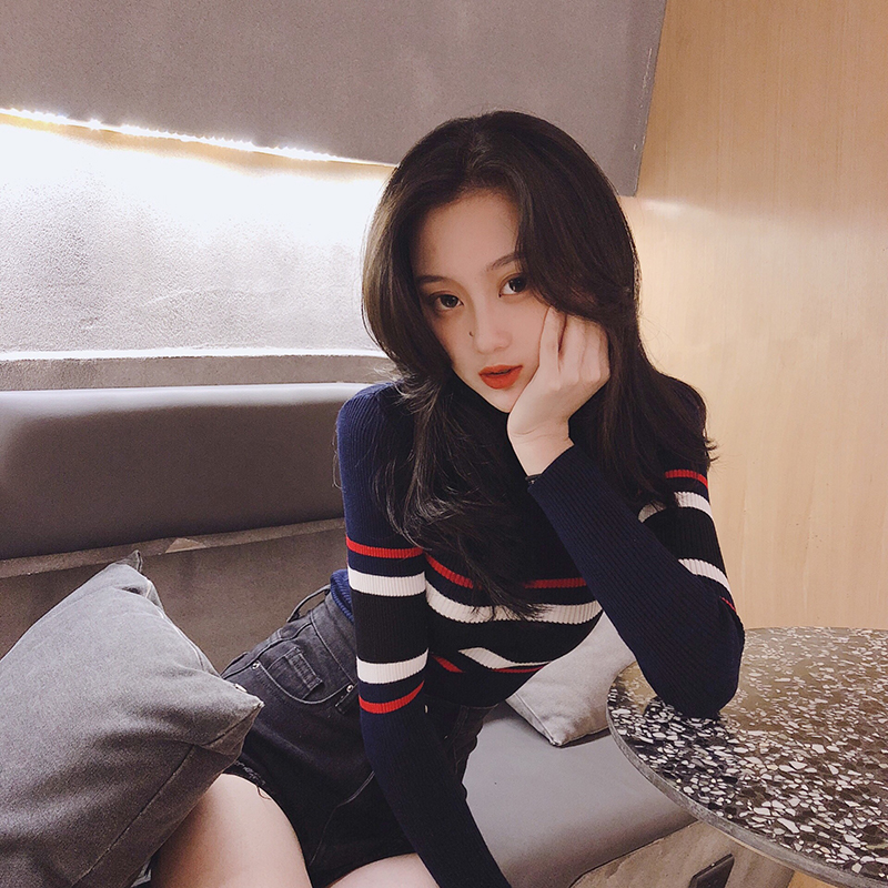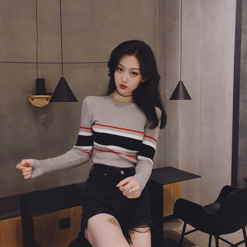 chic早秋上衣女2018新款韓版百搭套頭條紋長袖打底針織衫毛衣潮