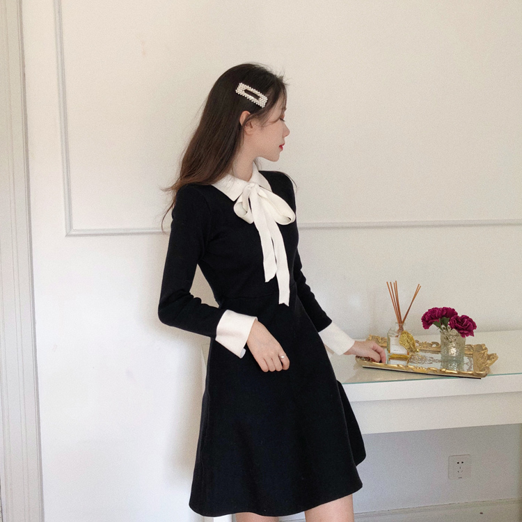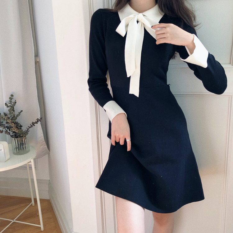 / 港味特色女裝秋2018新款女綁蝴蝶結設計韓版氣質顯瘦針織連衣裙女