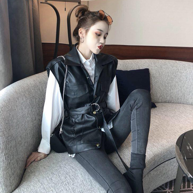秋裝新款時尚網紅套裝女港風PU皮機車無袖馬甲寬松襯衫兩件套