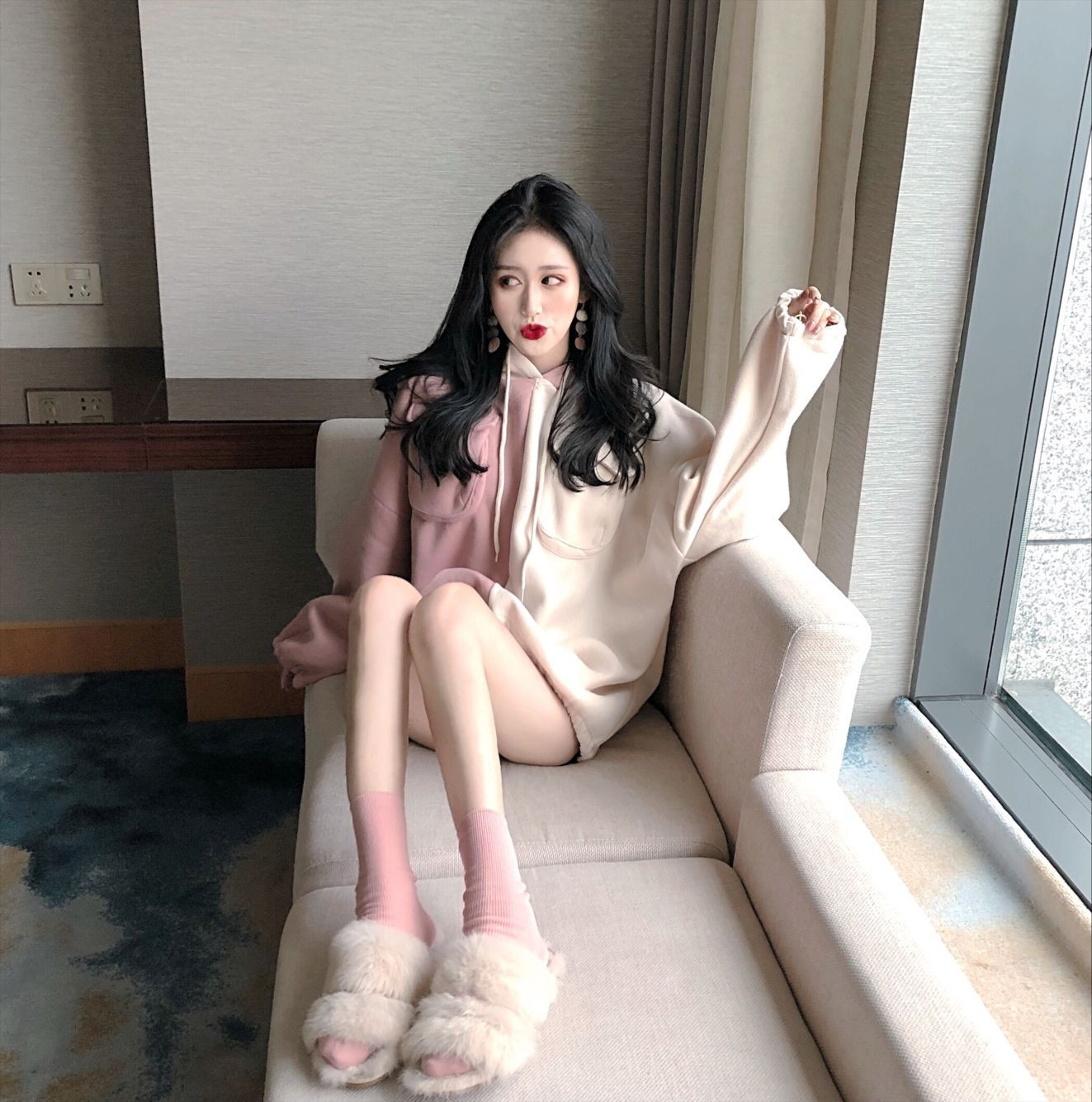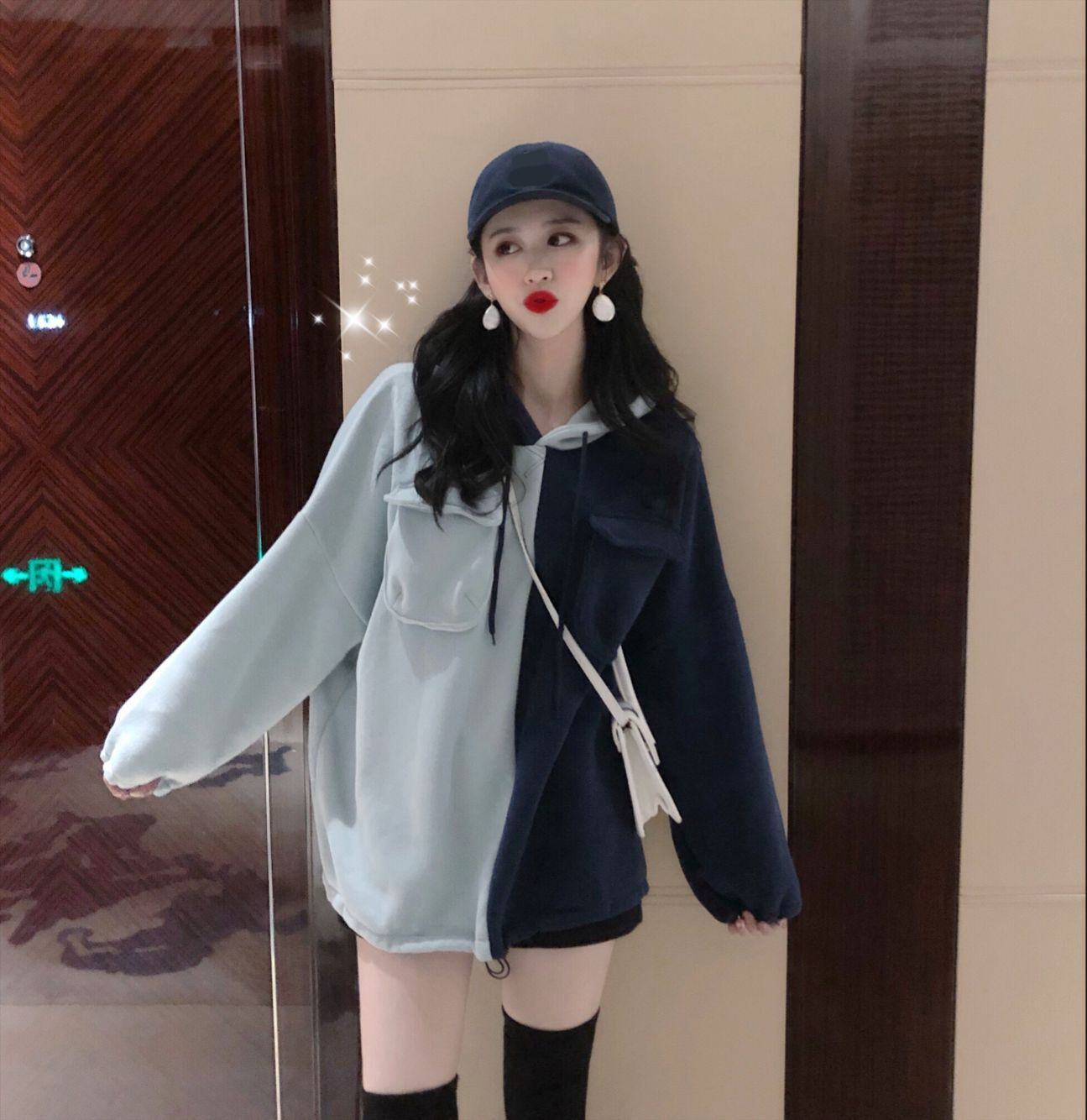 / 撞色拼接連帽個性口袋加絨加厚上衣女裝設計感秋季保暖抽繩衛衣潮