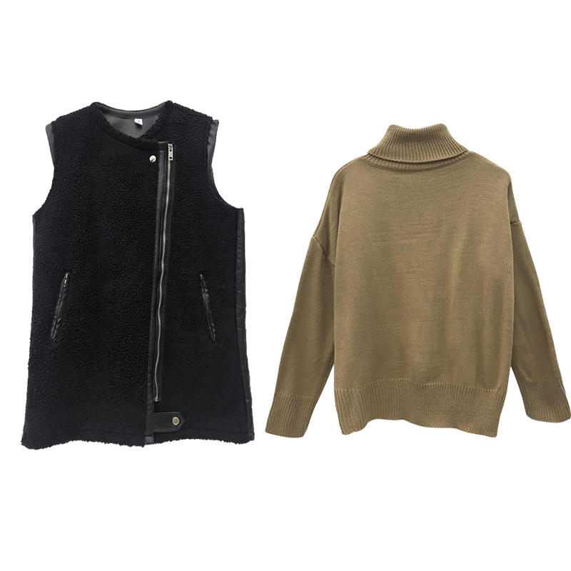 / 復古風百搭機車時尚套裝復合皮衣夾克外套高領針織衫毛衣兩件套女