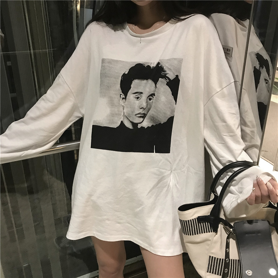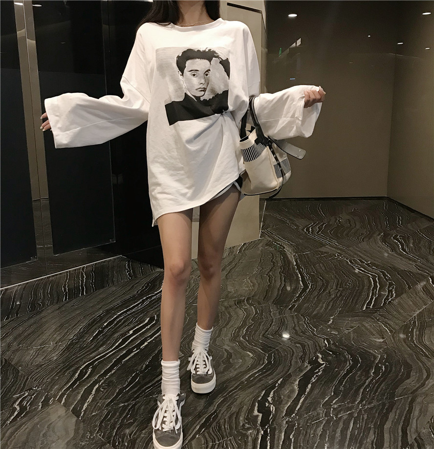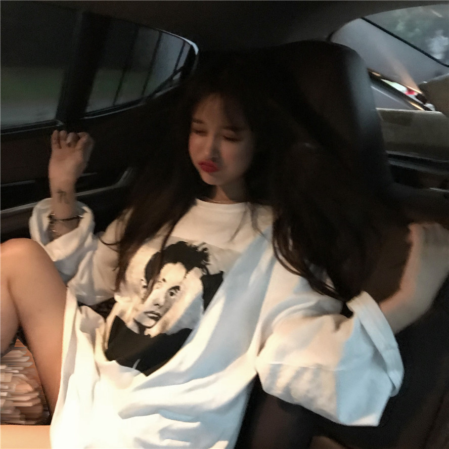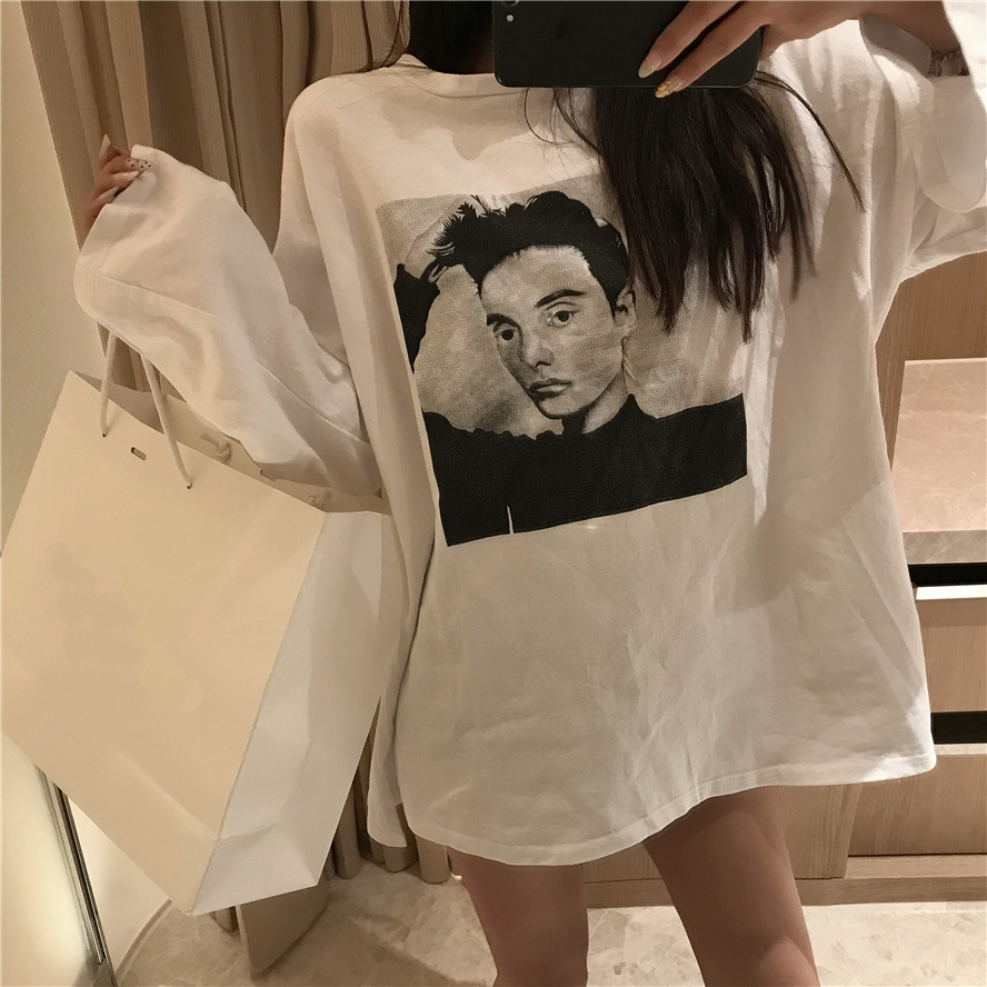 / 初秋韓版簡約少女chic印花長袖寬松百搭學生百搭上衣休閑白色t恤