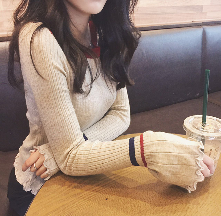 港風復古chic新款韓版修身顯瘦百搭氣質打底撞色領喇叭袖毛針織衫