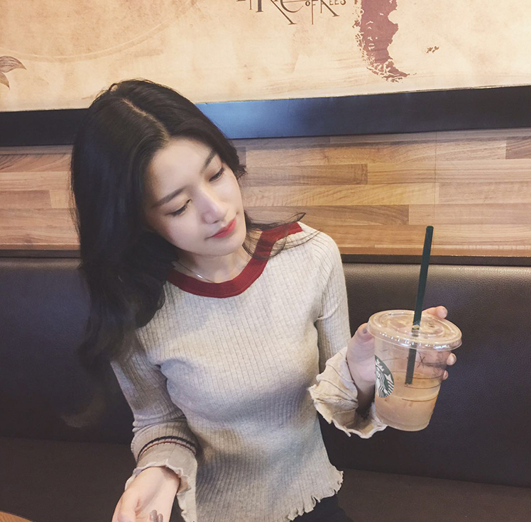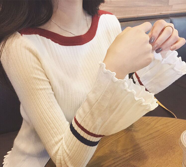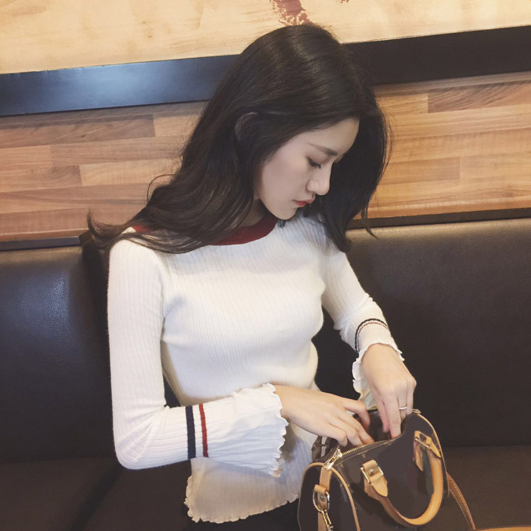 / 港風復古chic新款韓版修身顯瘦百搭氣質打底撞色領喇叭袖毛針織衫