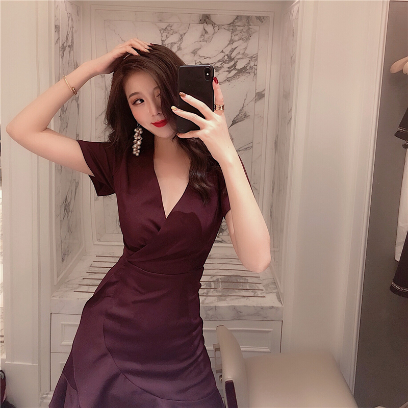 2018新款韓版夏季女復古chic短裙收腰顯瘦不規則V領荷葉邊連衣裙
