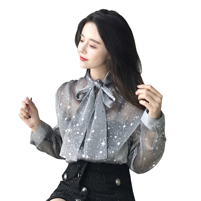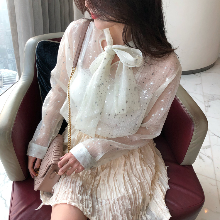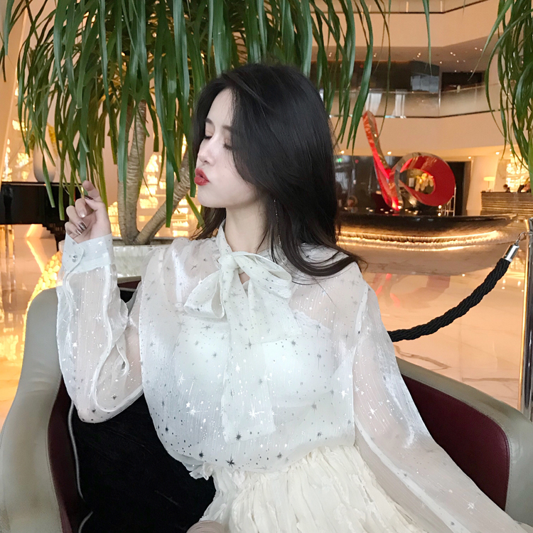 新款2018港味星空亮絲buling設計感蝴蝶結歐根紗chic上衣女長袖潮