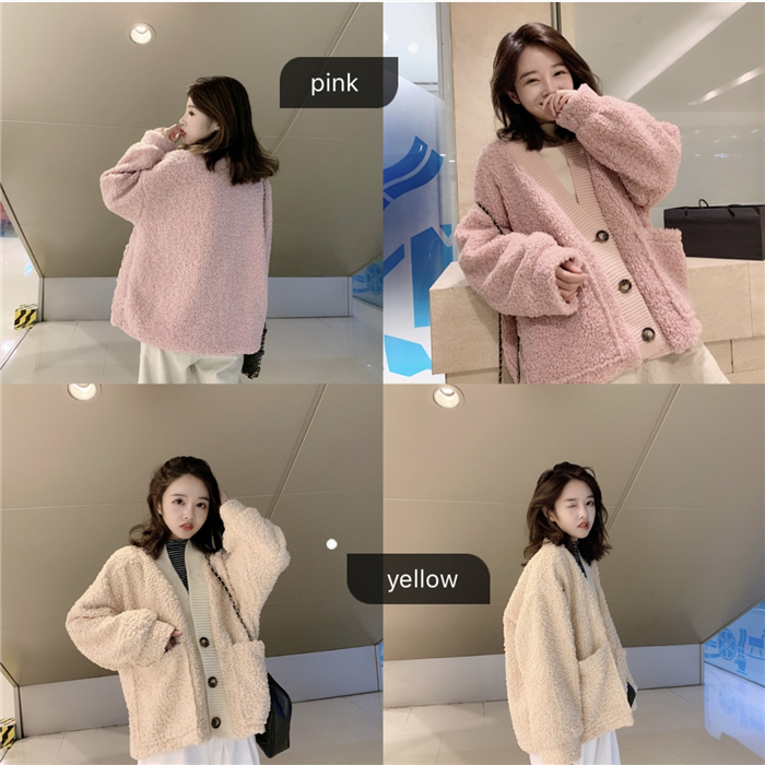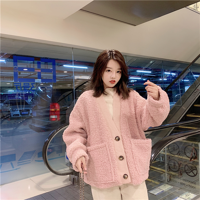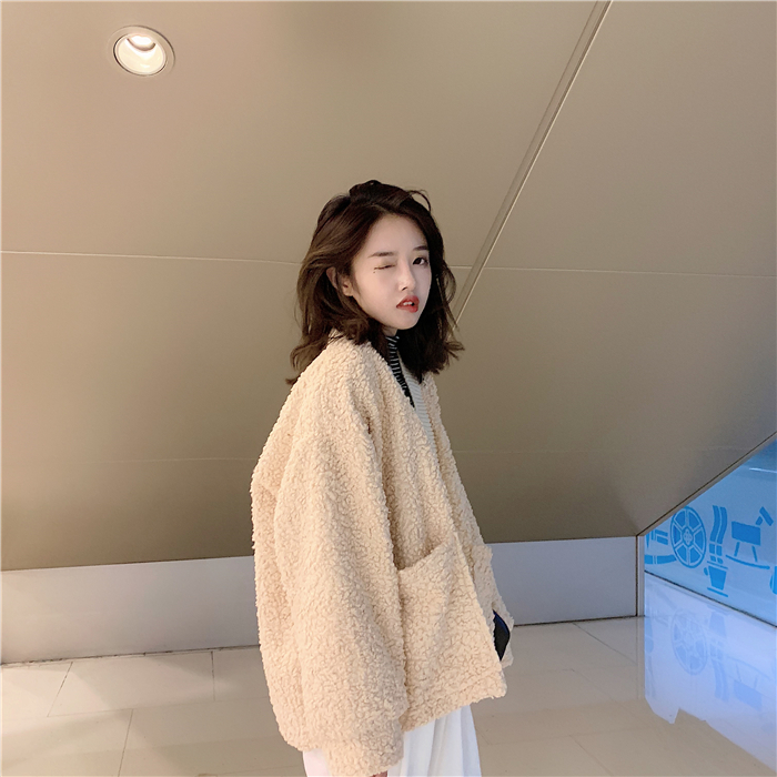 外套秋女2018新款加厚保暖V領單排扣口袋長袖寬松百搭羊羔毛大衣