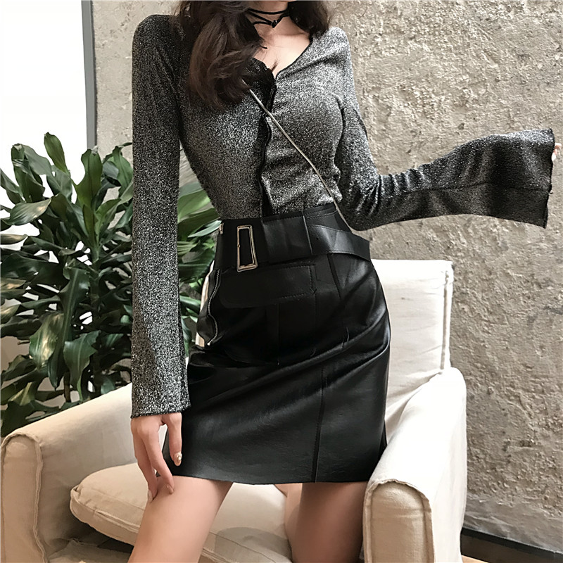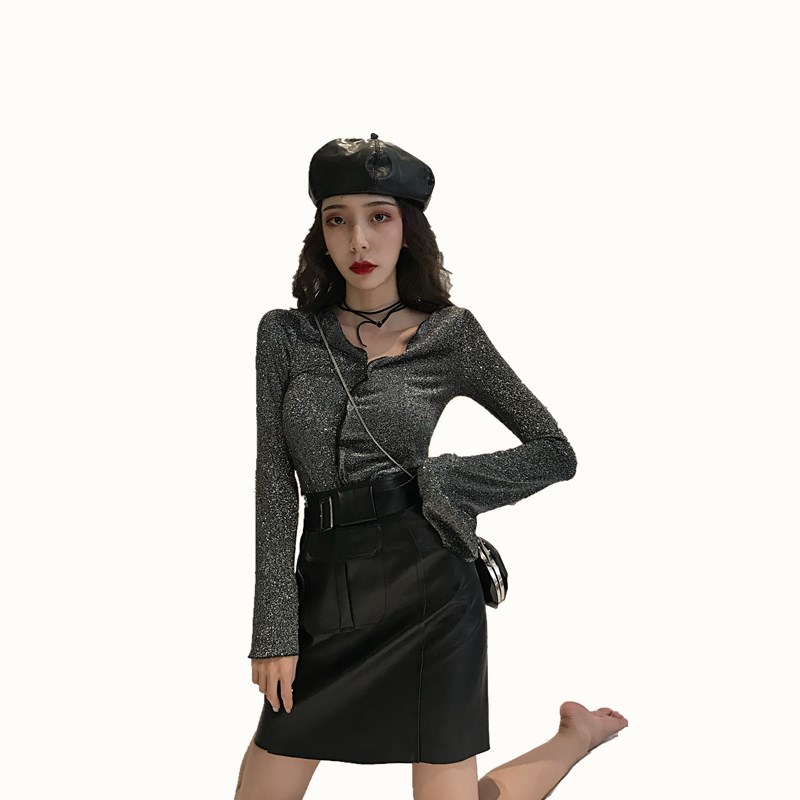 銀色上衣|黑色上衣|黑色皮裙|杏色皮裙