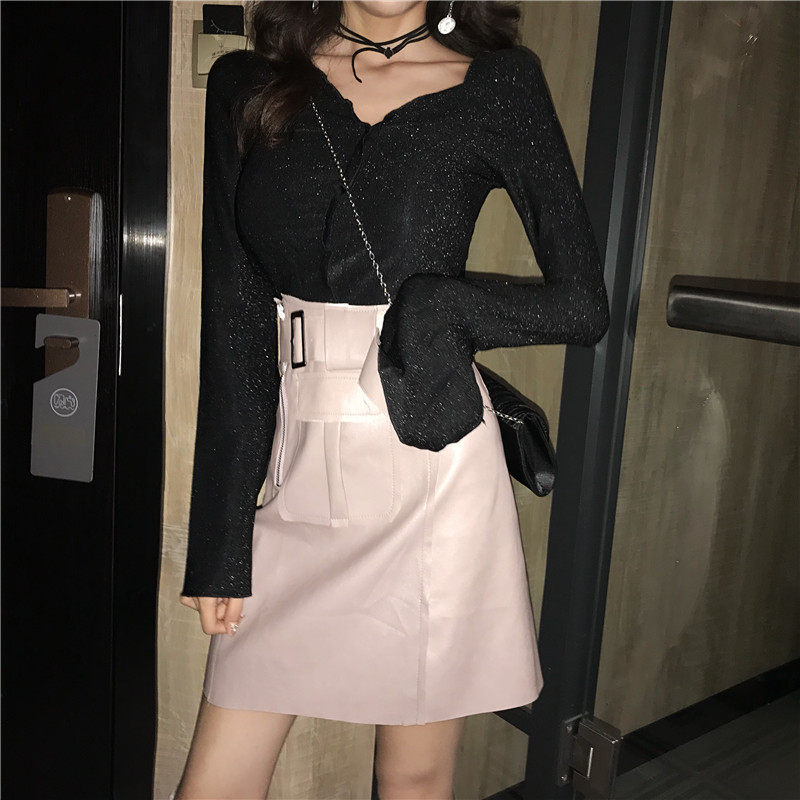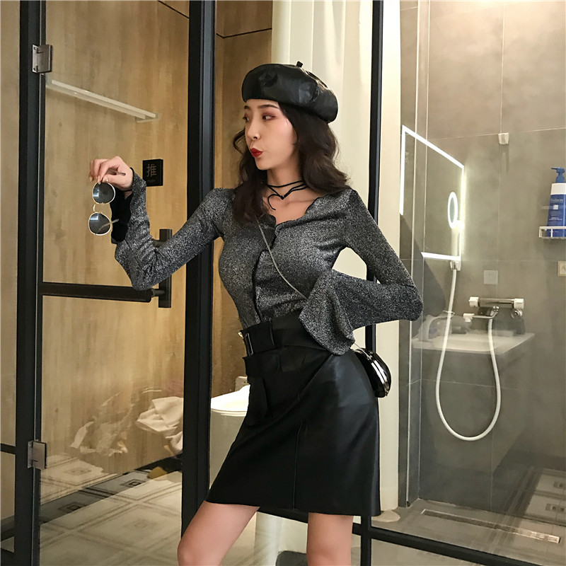 / 港味新款百搭顯瘦木耳邊喇叭袖T恤復古高腰半PU皮半身裙時尚套裝