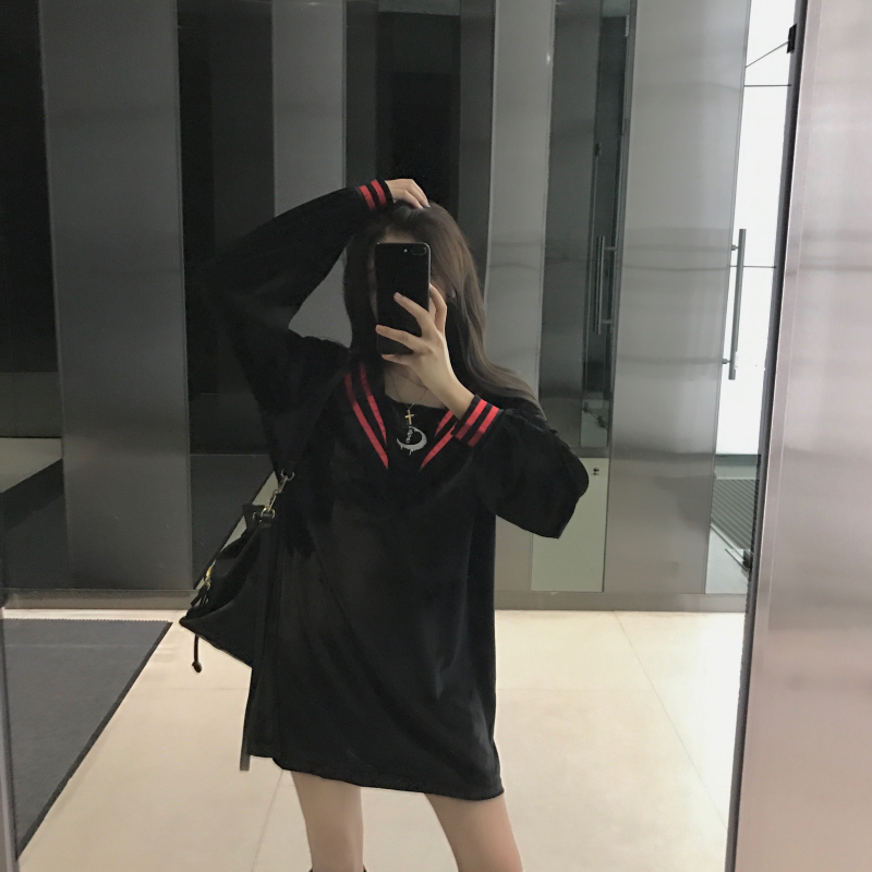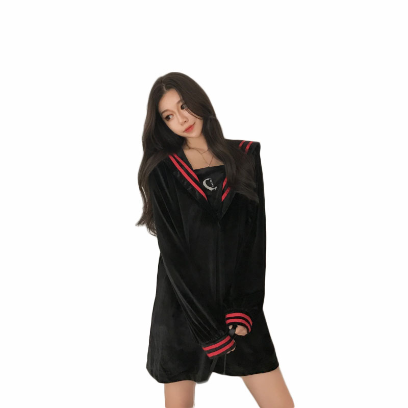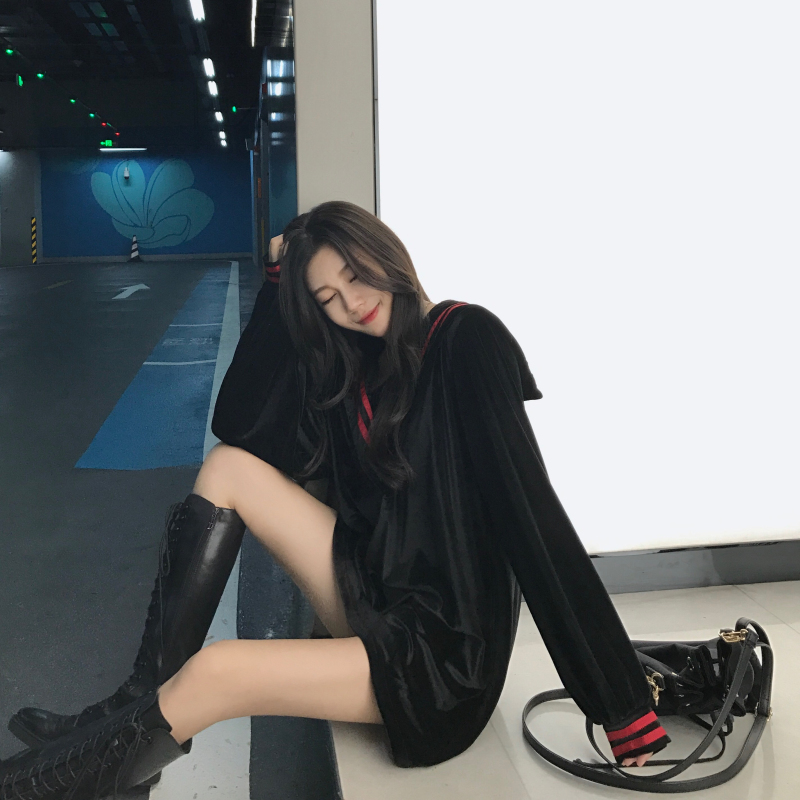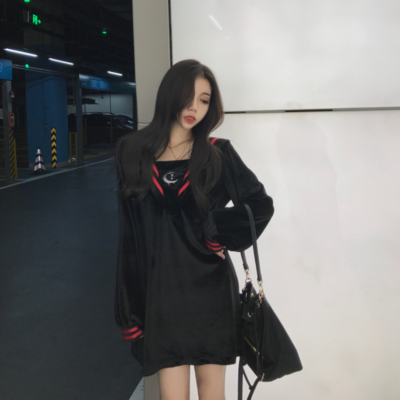 / 港味裙子女秋冬2018新款時尚復古條紋海軍領絲絨百搭長袖連衣裙女