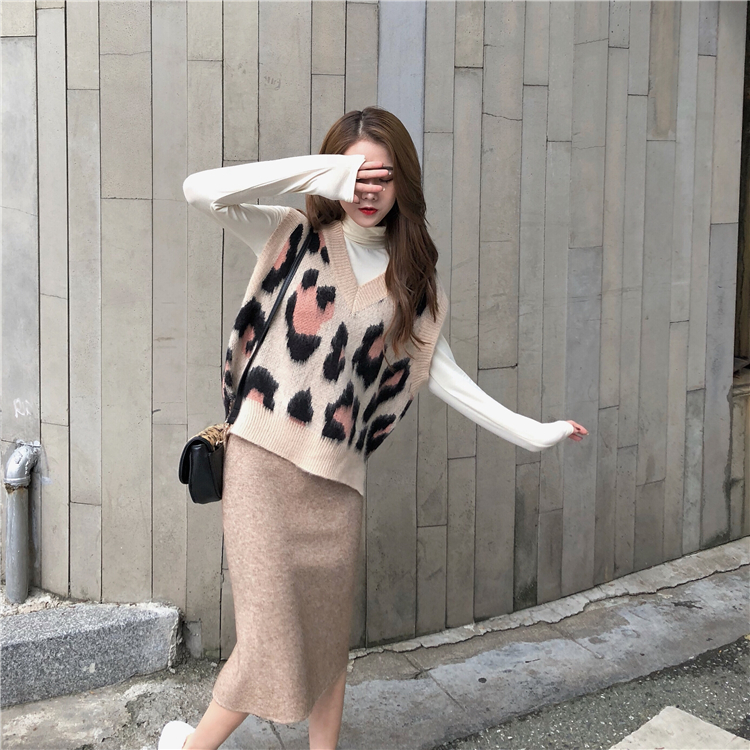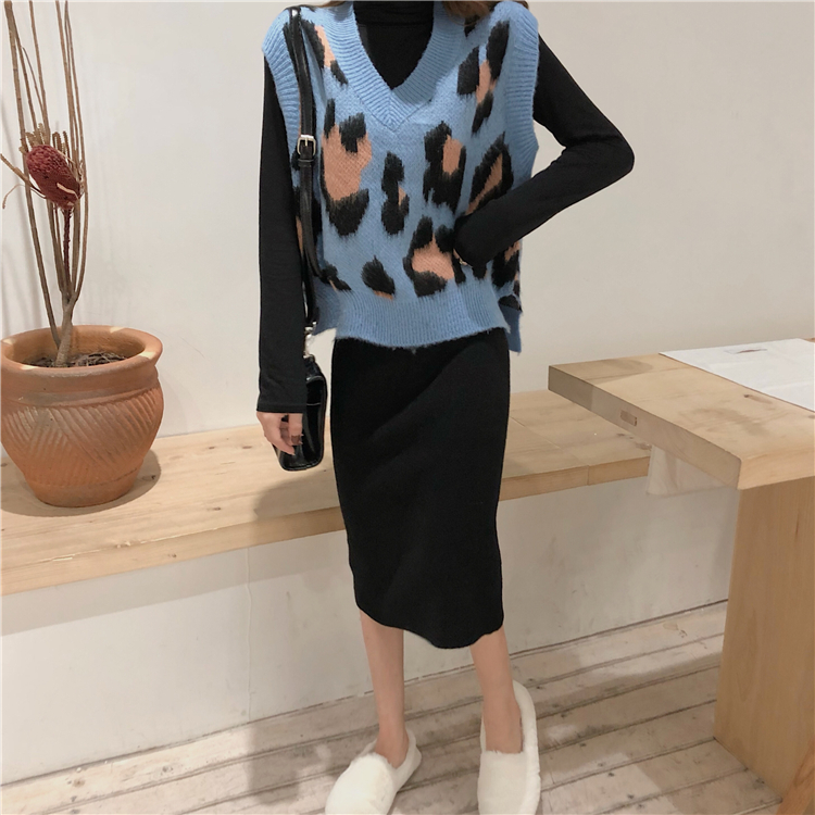 / 時尚撞色V領無袖豹紋針織背心馬甲+高領打底衫+針織包臀裙三件套