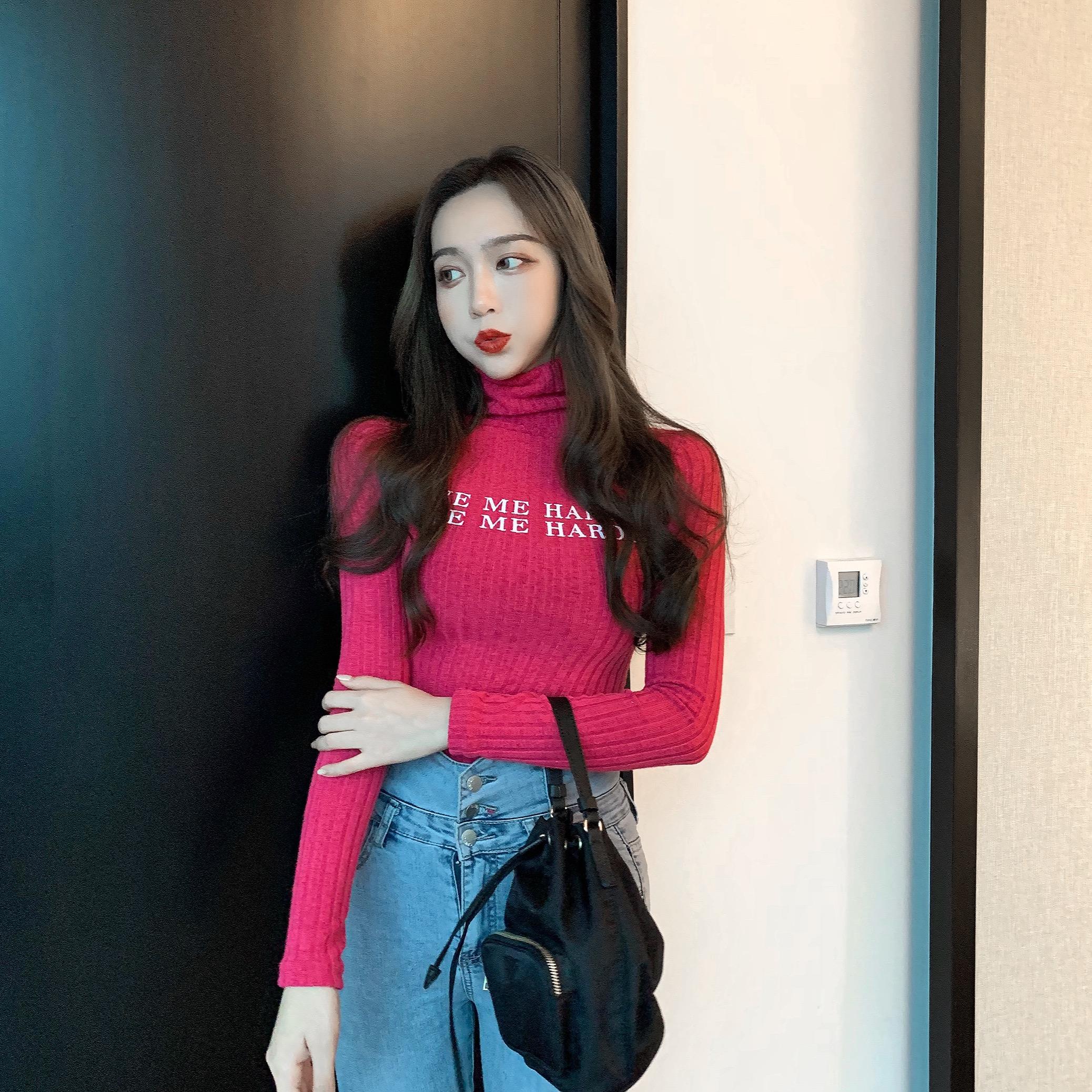 秋冬女裝新款韓版修身顯瘦字母印花高領彈力長袖套頭打底衫上衣潮