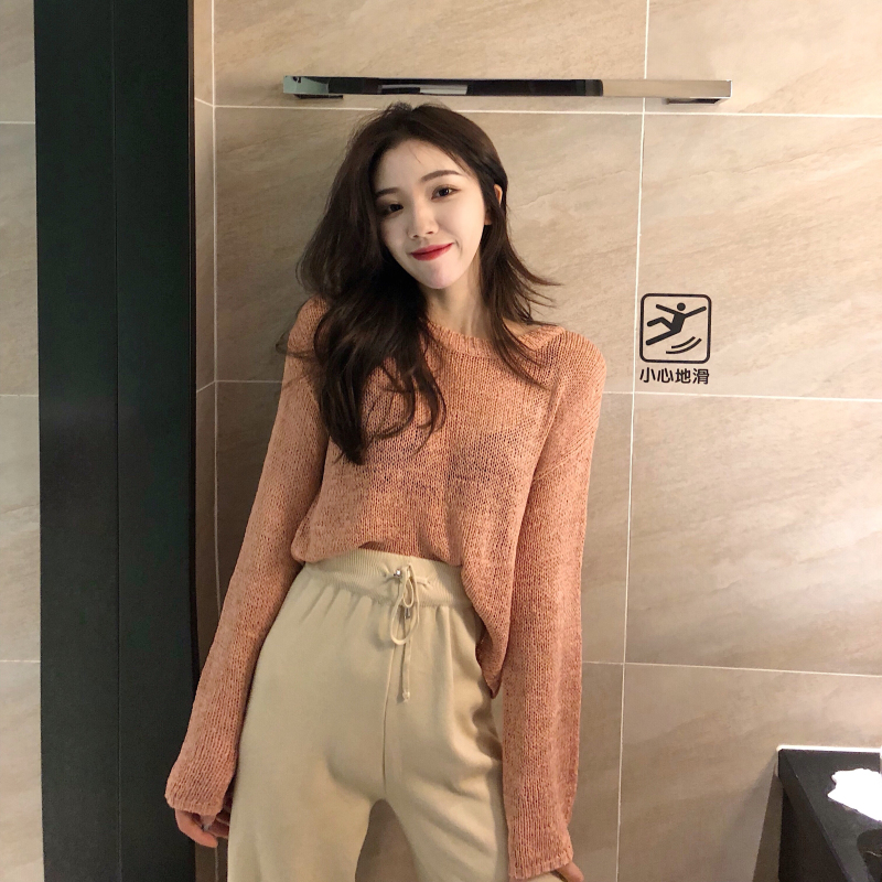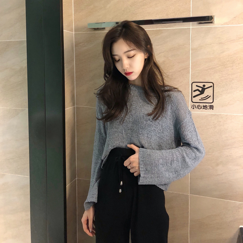 新款秋季韓版長袖短款針織衫套頭毛衣高腰闊腿褲針織長褲時尚套裝