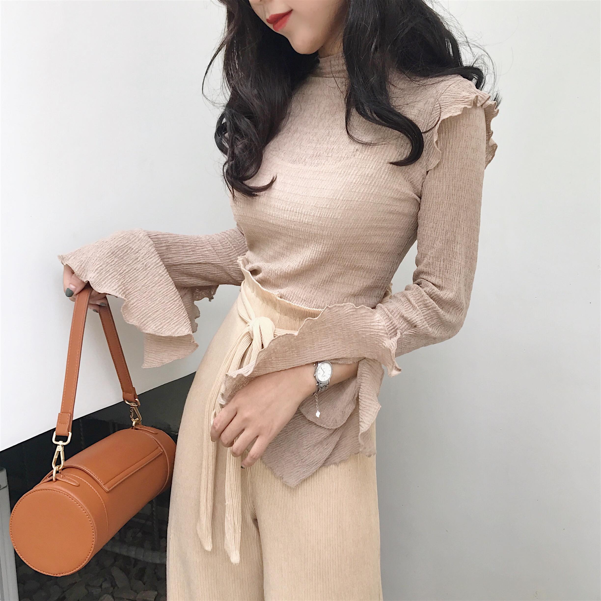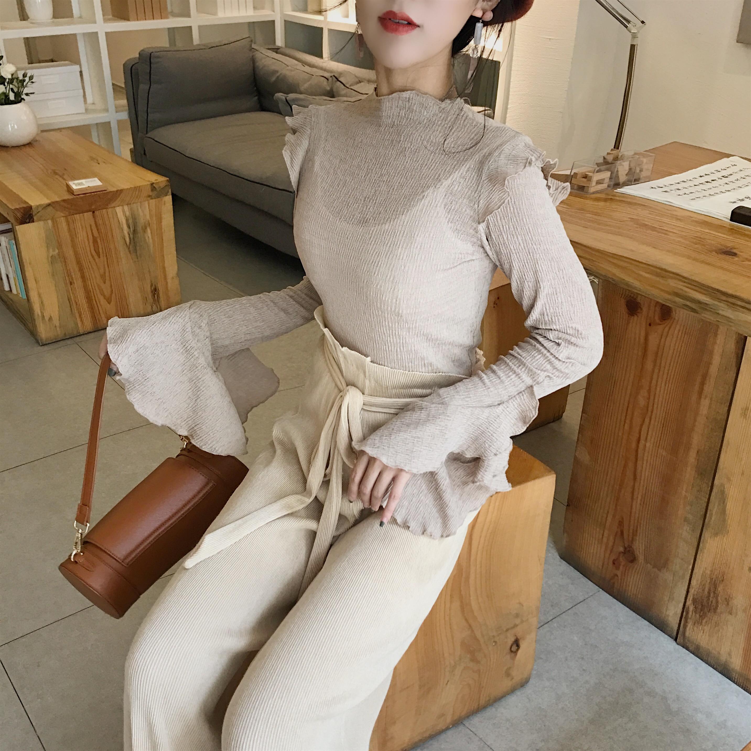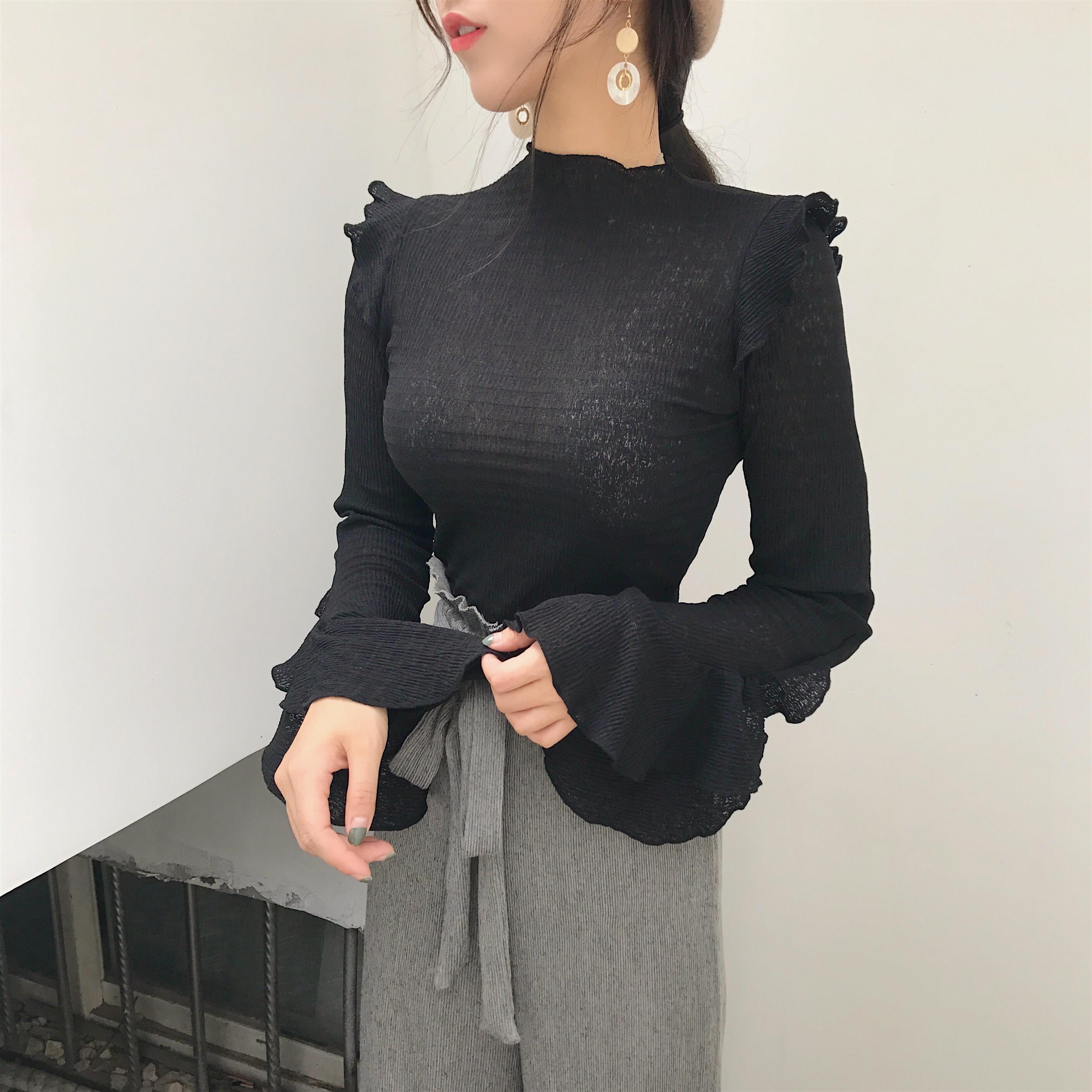 / 2018秋裝新款甜美復古chic彈力修身荷葉袖圓領韓版氣質百搭上衣女