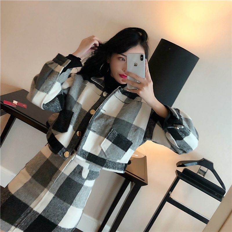 / 韓版時尚秋裝女2018新款套裝格子毛呢外套女+半身裙時尚兩件套潮