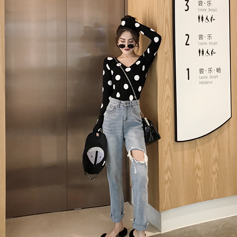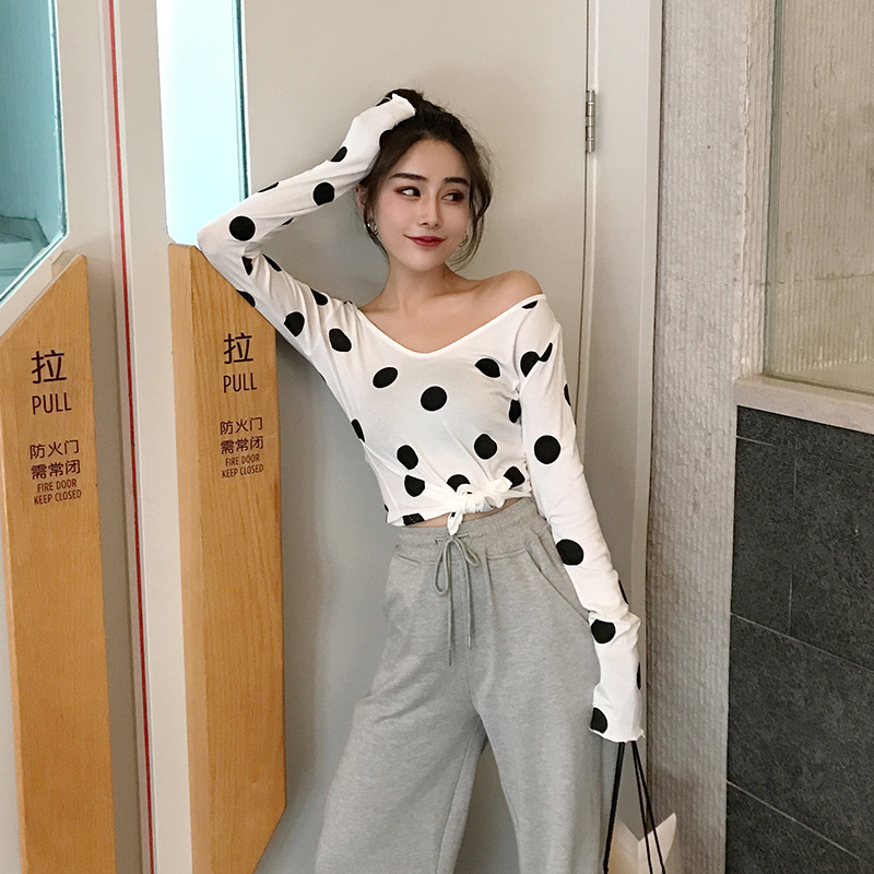 / 時尚百搭復古2018秋裝新款韓版上衣女港味V領波點打底顯瘦長袖T恤