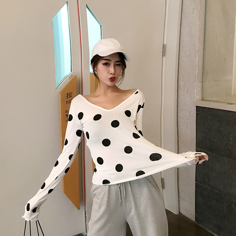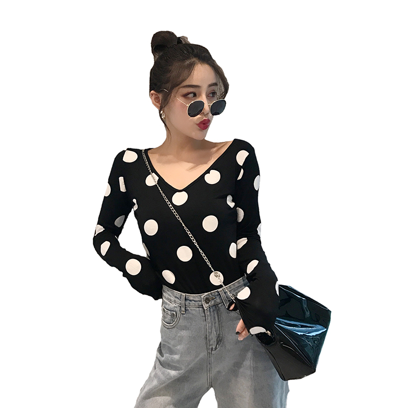 時尚百搭復古2018秋裝新款韓版上衣女港味V領波點打底顯瘦長袖T恤