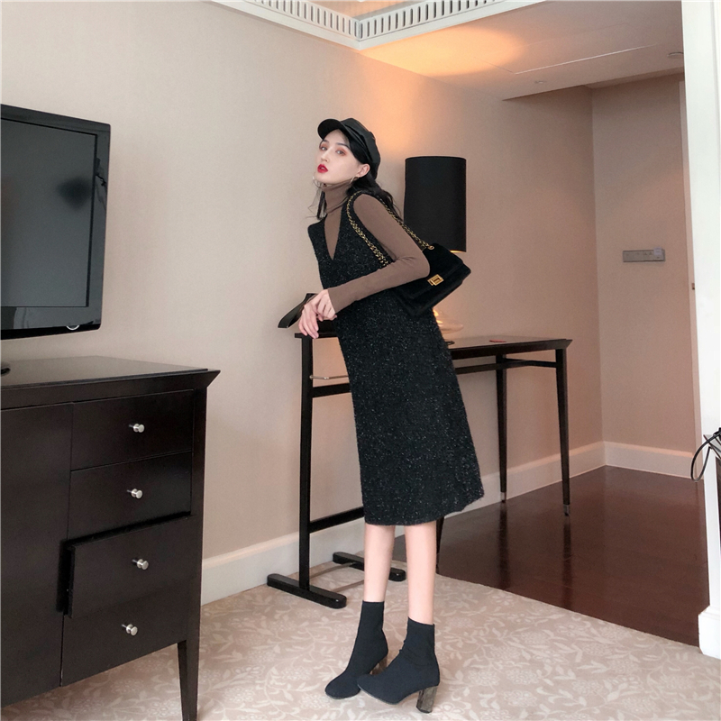 / 港味時尚女神套裝秋冬新款寬松亮閃針織長裙+加厚高領毛衣兩件套
