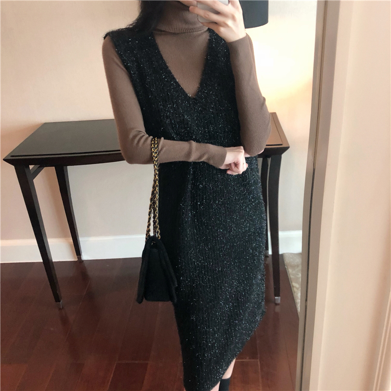 港味時尚女神套裝秋冬新款寬松亮閃針織長裙+加厚高領毛衣兩件套