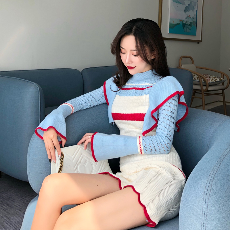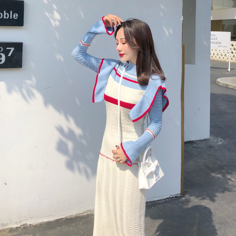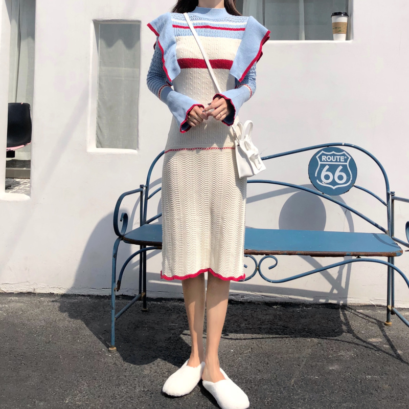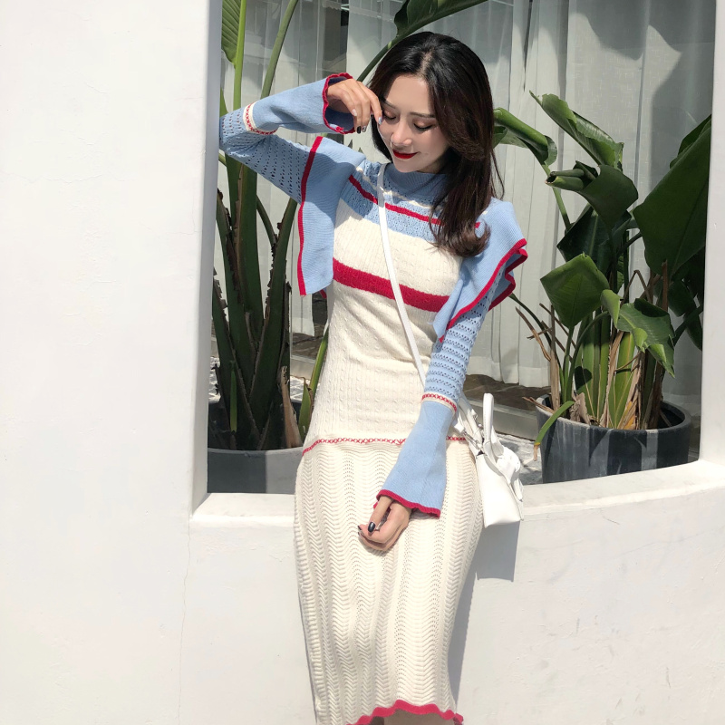 / 晚晚風新款韓版港味早秋款連衣裙百搭復古高腰中長款修身針織裙女