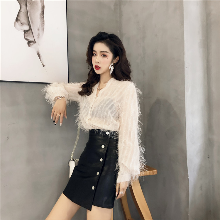 / 2018復古溫柔V領泡泡袖亮絲微透襯衫清時尚百搭毛毛上衣女裝秋潮