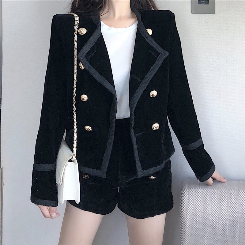 2018秋季港味新款名媛小香風金絲絨外套排扣金絲絨短褲時尚套裝女