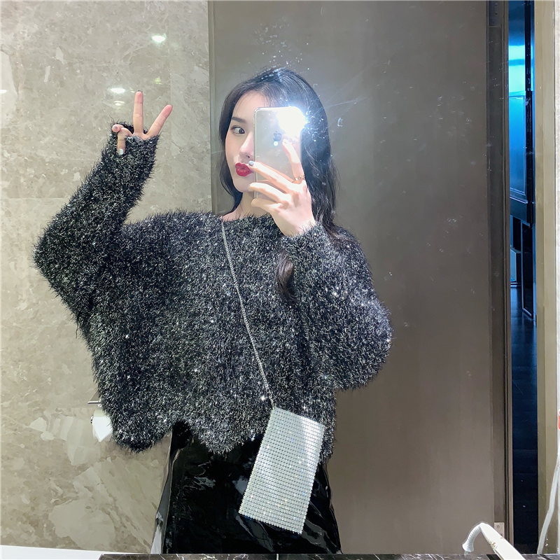 / 新款亮閃閃短款毛衣港風時尚套裝百搭亮皮半身裙包臀裙chic兩件套