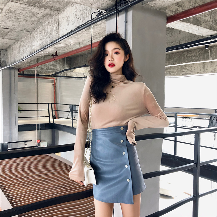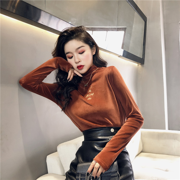 / 秋冬刺繡半高領新款韓版上衣女修身顯瘦chic風絲絨百搭打底衫T恤