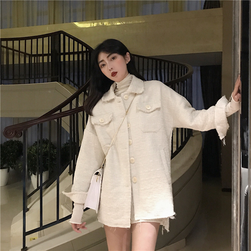 復古溫柔慵懶風隨意暖色系百搭寬松中長款毛呢外套女韓版呢子大衣