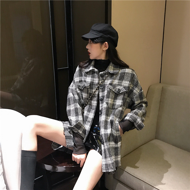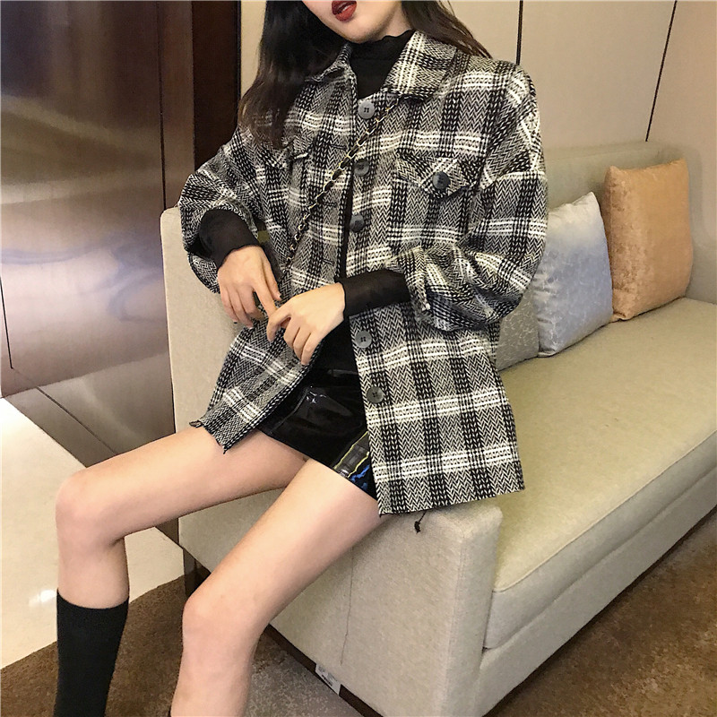 / 秋冬2018新款毛呢外套女中長款千鳥格子紋夾棉粗紡長袖呢子大衣女