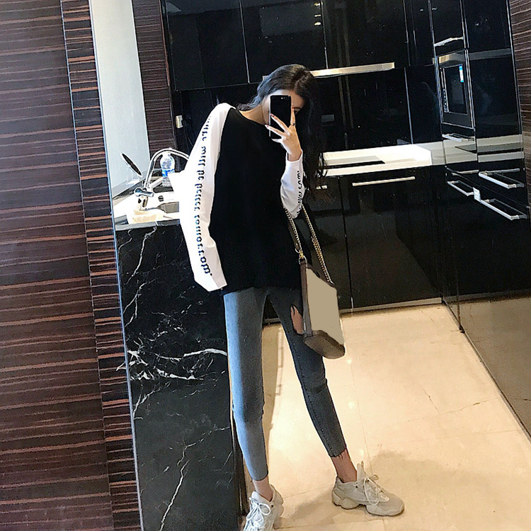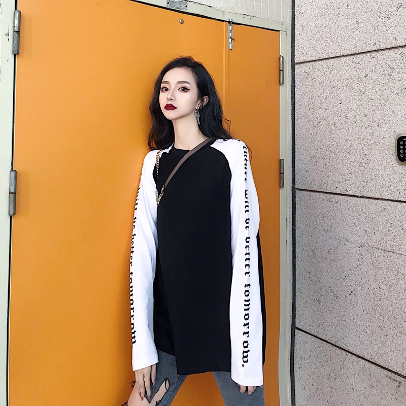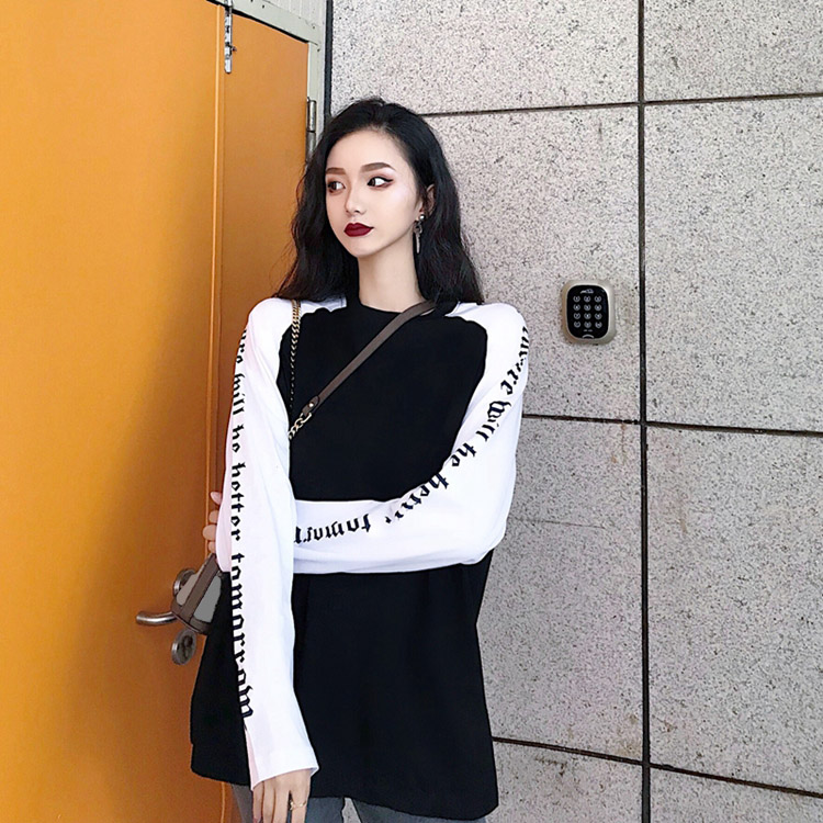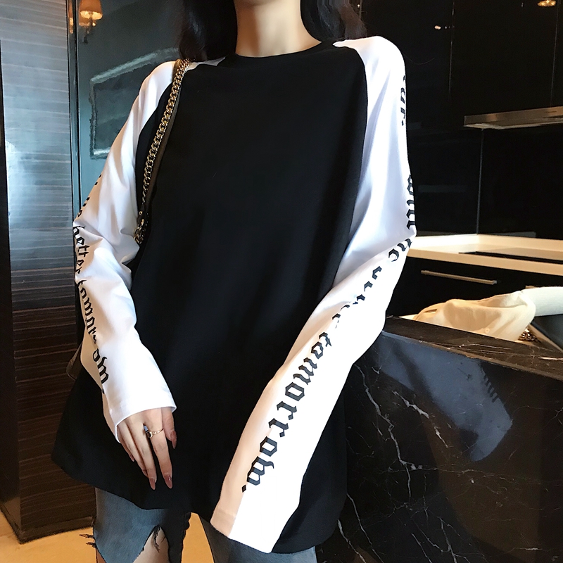 / 秋裝新款韓版上衣撞色字母印花插肩袖寬松中長款外穿打底長袖T恤