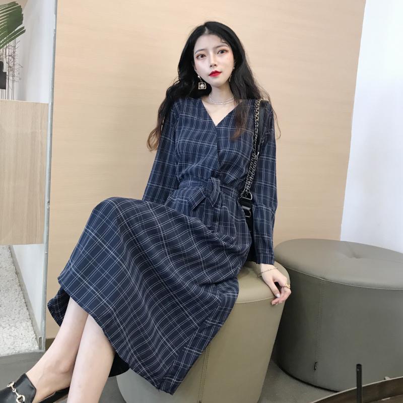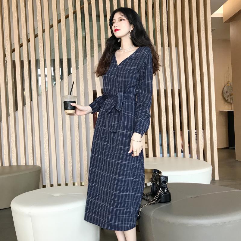 晚晚風秋季新款格子V領百搭chic時尚港味少女復古長裙連衣裙子潮