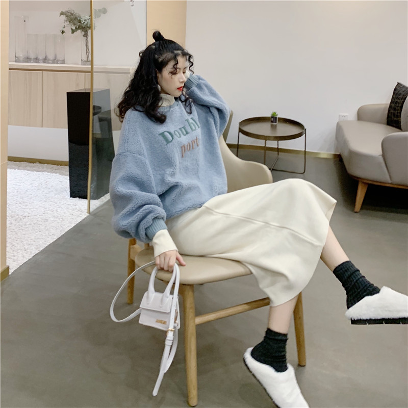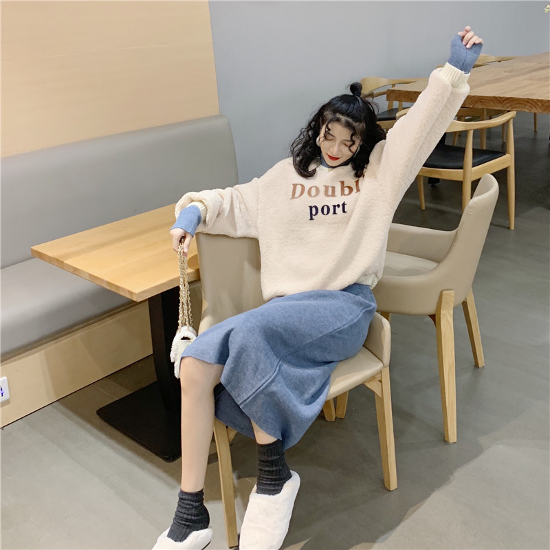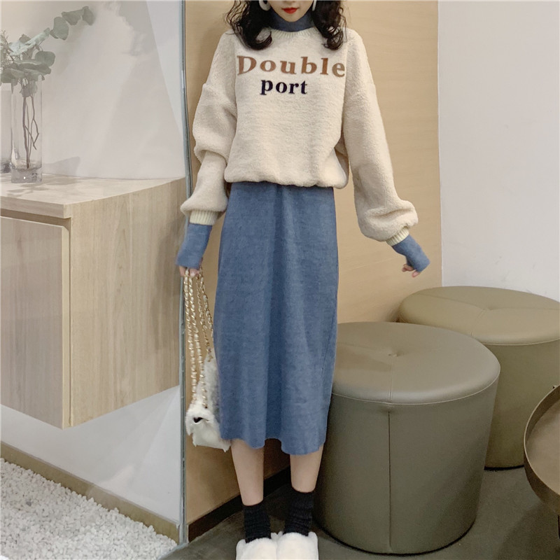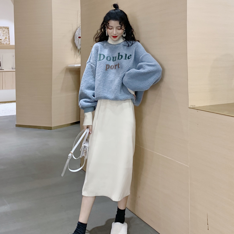 / 秋冬新款韓版時尚假兩件拼接衛衣高腰毛呢半身裙套裝chic兩件套女